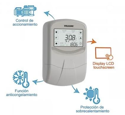 Mediante 2 sensores de temperatura (incluidos) determina cuando encender la bomba de pileta para calentar la misma y llegar a la temperatura de confort adecuada