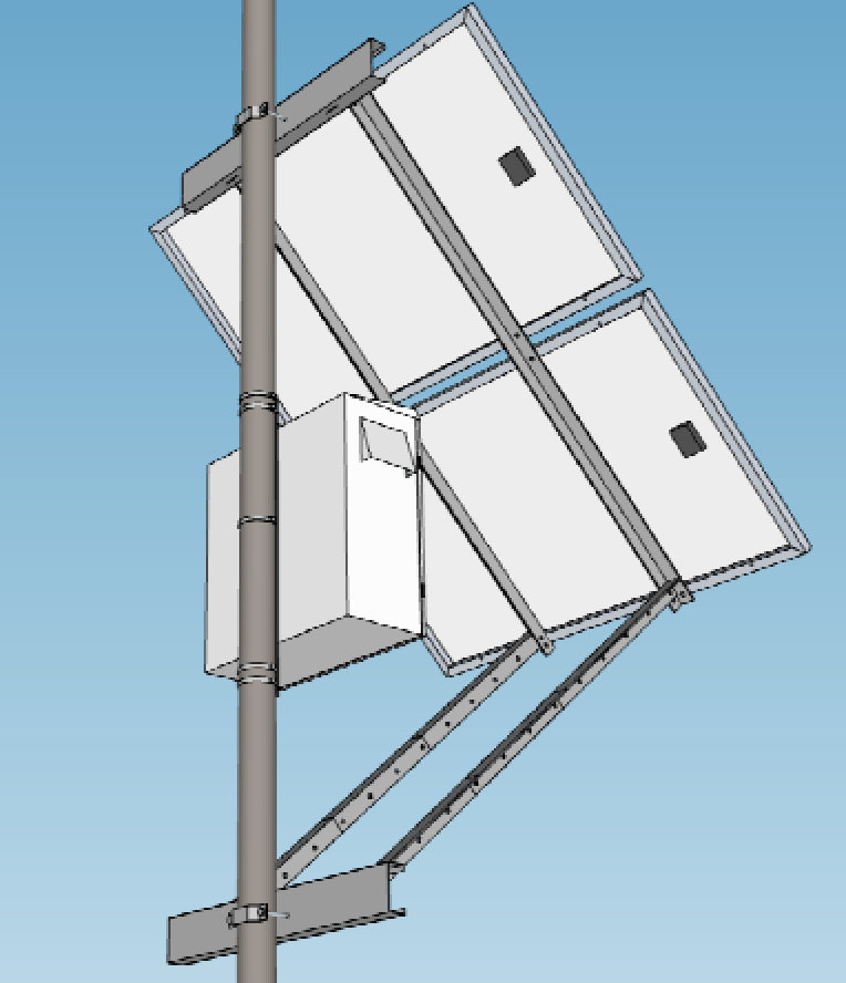 Gabinete exterior para sujeción en poste. Ideal videovigilancia, nodos Wifi, monitoreo, y aplicaciones aisladas de pequeños consumos sin red disponible. Incluye ya premontado un Regulador de carga Solar MPPT 12V e Inversor con Salida 220V senoidal modificada de 4 tomacorrientes internos, max potencia de salida 500W e indicador por contacto seco de batería baja. Se complementa con 1 ó 2 paneles 160~290W en serie y una (1) batería 12V de 100 a 225Ah AGM VRLA ó litio monobloque según necesidades de almacenamiento.