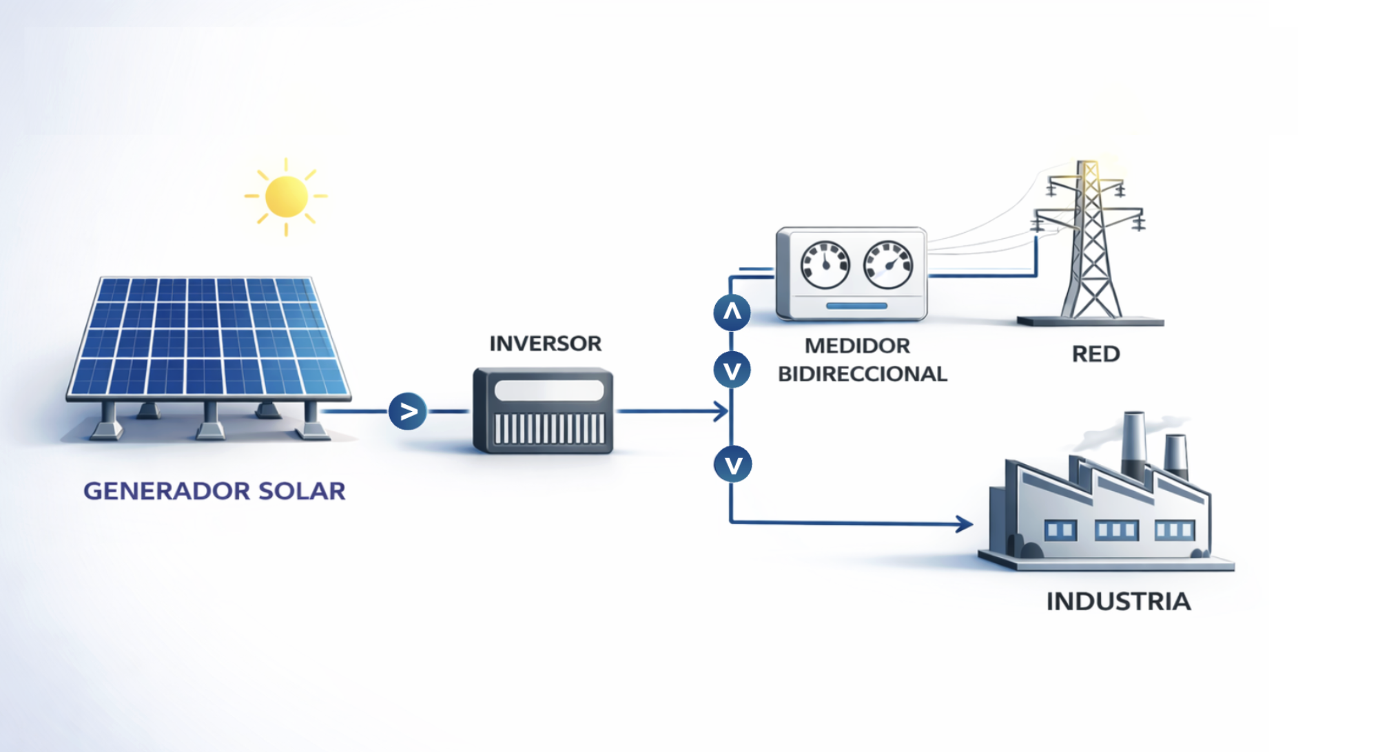 Una instalación fotovoltaica on-grid genera energía en corriente continua, la convierte a corriente alterna sincronizada con la red y la inyecta al tablero general de la planta para abastecer consumos en tiempo real. Cuando la generación solar no alcanza, la empresa toma el faltante de la red y, cuando genera por encima de la demanda instantánea, puede inyectar excedentes según el esquema aplicable.